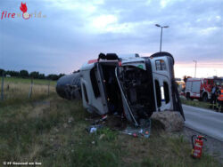 NICKELSDORF (BGLD): In der Nähe des Grenzüberganges Nickelsdorf ereignete sich am Dienstagabend, 16. Juni 2015, bei der Zufahrt zu einem Lkw-Parkplatz ein Tankwagenunfall. Aus ungeklärter Ursache kam ein Lkw-Lenker in einer Kurve von der Fahrbahn ab, kippte um und blieb seitlich liegen.