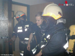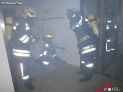 Innerhalb kürzester Zeit rüsteten sich Atemschutzträger aller drei beteiligter Feuerwehren mit umluftunabhängigem Atemschutz aus. Der erste Atemschutztrupp des Tanklöschfahrzeuges 1 ging mit einer C-Löschleitung in den verrauchten Bereich vor und konnte rasch den Brandherd entdecken und ablöschen. Anschließend wurden nach und nach die Atemschutztrupps zur Personenrettung eingesetzt. Insgesamt zehn Personen wurden gerettet und der nachalarmierten Notärztin bzw. Pflegepersonal zur Erstversorgung übergeben. Zwei Personen wurden unter anderem aus einem nahe gelegenen Liftschacht gerettet, da diese zur Zeit des Brandausbruches Wartungsarbeiten am Aufzug durchführten.