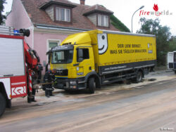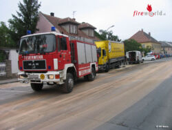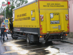 Bei einem Lkw war der Tank leckgeschlagen und es traten ca. 400 Liter Diesel aus. Die Erstmaßnahme der Feuerwehr war das Abdichten der Kanäle, um weiteren Dieseleintritt in die Kanalisation zu verhindern. In weiterer Folge wurde unter dem Tank ein Auffangbehälter positioniert. Nach diesen Maßnahmen konnte begonnen werden, den ausgetretenen Treibstoff zu binden. Insgesamt wurden dabei 10 Säcke Ölbindemittel aufgetragen.