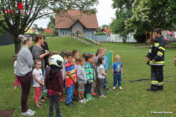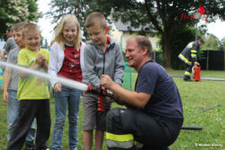 Weitere Kameraden beruhigten zeitgleich die verstörten Kinder und achteten darauf, dass keines von ihnen aus Neugier den Gefahrenbereich betritt. Nach der Brandübung wurde den Kindern die richtige Vorgehensweise im Brandfall erklärt und Kenntnisse der Notrufnummern wurden aufgefrischt. Im weiteren Verlauf konnten die Kinder ihre Fertigkeiten an einer aufgestellten Spritzwand unter Beweis stellen. Des Weiteren war es ihnen möglich, mit einem Hochdruck – Strahlrohr zu spritzen. Etwaige auftauchende Fragen über die Fahrzeuge oder auch die Feuerwehr im Allgemeinen wurde den Kindern fachgerecht beantwortet. Auch die Gerätschaften wurden genauestens unter die Lupe genommen und jedes der Kinder konnte sich in die Fahrzeuge setzen und sich wie ein Feuerwehrmann fühlen.