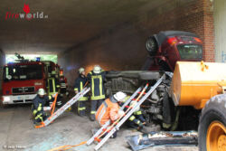 Auf einer Nebenstraße war es zu einem schweren Verkehrsunfall gekommen. Ein Radlader befuhr mit hoher Geschwindigkeit die Straße in Richtung Krelingen. Mehrere PKW´s, die wegen eines Staus auf der Autobahn den Grünenplanweg als Ausweichroute nutzen, kamen ihm entgegen. Im Bereich einer Autobahnbrücke hatte der Radlader plötzlich einen Motorschaden, seine Räder blockierten und er schleuderte herum. Ein mit vier Personen besetzter Pkw, der ihn gerade passieren wollte, versuchte noch auszuweichen und fuhr dabei ungebremst unter die Schaufel des Radladers. Zwei weitere Fahrzeuge krachten ebenfalls in die Unfallstelle hinein, sie kamen seitlich bzw. auf dem Kopf liegend zum Stehen, dadurch wurde der erste Pkw komplett eingeklemmt.