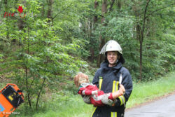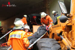 Nach einer kurzen Erkundung durch den Einsatzleiter wurden die Aufgaben verteilt; der leicht verletzte Fahrer des Radladers sowie eine ebenfalls nur leicht verletzte Unfallbeteiligte wurden betreut, der Brandschutz wurde sichergestellt und die Fahrzeuge mit Baustützen und Steckleiterteilen gegen unbeabsichtigtes Wegrutschen gesichert. In zwei Abschnitten wurde dann in gemischten Gruppen die technische Rettung eingeleitet. Dazu wurde massiv Rettungsmaterial eingesetzt, bspw. mehrere Aggregate, die Rettungsschere, der Rettungsspreitzer, der hydraulische Pedalschneider, Rettungszylinder, Säbelsäge und Hebekissen, um nur einige zu nennen. Es zeigte sich wieder, wie wichtig der RW2 mit seiner Beladung bei größeren Technischen Hilfeleistungen ist. Insgesamt mussten 14 Personen gerettet werden, ein vermisstes Kind wurde im nahegelegenen Waldbereich gefunden und der leicht verletzten Mutter übergeben. Erschwert wurde die Arbeit dadurch, dass ein beteiligter Pkw als Kurierfahrzeug kleine Mengen Gefahrgut geladen hatte, glücklicherweise waren die Behälter nicht defekt.