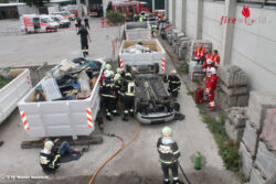 Nach einer kurzen Suche wurde dann ein am Dach liegendes Auto gefunden, in dem mehrere Personen unterschiedlichsten Grades verletzt und im Fahrzeug eingeschlossen oder eingeklemmt waren. Damit begann der stressige Teil für die Einsatzkräfte. Während sich die anwesenden Kräfte umgruppieren mussten und mit der Rettung und Versorgung der Schwerverletzten begannen, wurden weitere Rettungsmittel angefordert. Bei der Rettung der Eingeklemmten kamen mehrere hydraulische Rettungsgeräte zum Einsatz. In Zusammenarbeit mit den Rot Kreuz- Kräften konnten alle Verletzten schonend aus dem Fahrzeugwrack gerettet werden. Sie wurden anschließend von einem Notarzt- und mehreren Rettungsmitteln versorgt und abtransportiert.