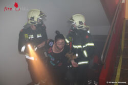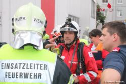 Der Zugang zum Keller über die Hauptstiege wurde somit unzugänglich. Um in den vom Brand betroffenen Gebäudeteil zu gelangen, veranlasste der Einsatzleiter den Zugang über die Drehleiter durch den zweiten Stock des Gebäudes. Während ein Atemschutztrupp die Personensuche durchführte, ging ein weiterer mittels C- Leitung zur Brandbekämpfung vor. Während der Personensuche wurden in einem rauchfreien Raum zwei Schwerverletzte gefunden. Während einer sofort über den Angriffsweg gerettet werden konnte, war der andere Verletzte nach der Explosion unter einer Maschine im Beinbereich eingeklemmt. Um den Verletzten retten zu können, musste unter Atemschutz schweres Bergegerät herangeschaft werden. Eine Mammutaufgabe für die eingesetzte Mannschaft. Da sich die Bergung länger gestalten würde, veranlasste der Einsatzleiter der Feuerwehr, über die Einsatzleiterin des Roten Kreuzes, die Ausrüstung des anwesenden Notarztes und eines Notfallsanitäters mit Atemschutz um den Schwerstverletzten während der Rettungsarbeiten stabilisieren zu können. Nach einer Kurzeinweisung gingen die Retter, begleitet von einem Feuerwehrtrupp, durch den Rauch zum Verletzten vor. So konnte der Verletzte während der gesamten Dauer der technischen Bergung versorgt und so am Leben erhalten werden.