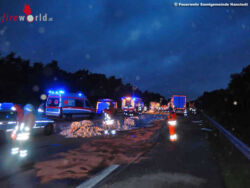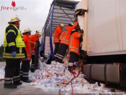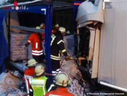 Um an die Kabine zu gelangen, musste die Feuerwehr zunächst weitere Teile der Ladung entfernen. Da durch den aufgerissenen Fahrzeugtank auch mehrere hundert Liter Diesel ausgelaufen waren, wurde die Einsatzstelle großflächig mit Ölbindemittel abgestreut sowie die entsprechende Fachbehörde des Landkreises Harburg zur Einsatzstelle gerufen. Nach Angaben der Polizei war es auf Grund eines Wildwechsels zu dem Stau gekommen, auf dessen Ende der Fahrer aufgefahren war.