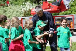 Im Stationsbetrieb gab es neben der Präsentation des Tanklöschfahrzeuges 1 und des Schweren Rüstfahrzeuges auch die Möglichkeit sich mit dem Strahlrohr an einem Zielspritzen zu beteiligen. Viele Ausrüstungsgegenstände konnten getestet und auch das Atemschutzgerät einmal angelegt werden. Trotz all dieser Möglichkeiten fieberten die Kinder von Beginn an auf das Highlight des Besuches – die Fahrt mit der Drehleiter in luftiger Höhe über Waidhofen/Thaya.
