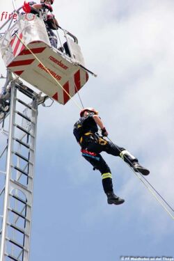 Im Anschluss daran wurde den jungen Besuchern das Jahresrückblick-Video 2014 im Schulungsraum vorgeführt. Hier konnten sich die Schülerinnen und Schüler einen noch genaueren Überblick über die Tätigkeiten der Freiw. Feuerwehr Waidhofen/Thaya machen. Bevor es dann aber wieder zurück in die Schule ging, gab es noch zwei Abschlussattraktionen. Zwei Mitglieder der Höhenrettungsgruppe Waidhofen/Thaya seilten sich aus 30 Meter Höhe vom Drehleiterkorb aus ab und die Besucher konnten dies hautnah mitverfolgen.