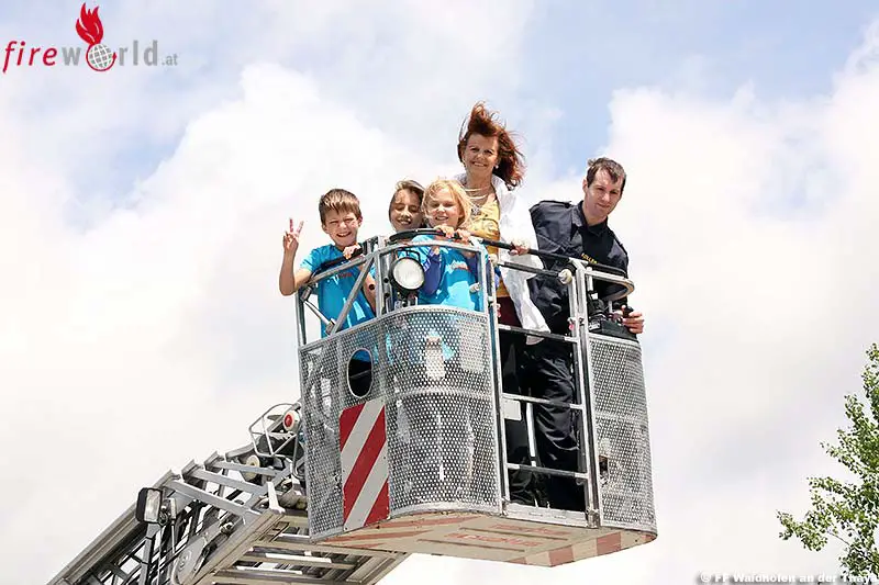 Im Stationsbetrieb gab es neben der Präsentation des Tanklöschfahrzeuges 1 und des Schweren Rüstfahrzeuges auch die Möglichkeit sich mit dem Strahlrohr an einem Zielspritzen zu beteiligen. Viele Ausrüstungsgegenstände konnten getestet und auch das Atemschutzgerät einmal angelegt werden. Trotz all dieser Möglichkeiten fieberten die Kinder von Beginn an auf das Highlight des Besuches – die Fahrt mit der Drehleiter in luftiger Höhe über Waidhofen/Thaya.