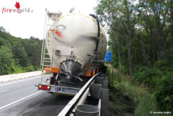 ALLAND (NÖ): Zu einer aufwändigen Lkw-Bergung alarmierte der diensthabende Disponent der Bezirksalarmzentrale Baden die Feuerwehr Alland in den Nachmittagsstunden des 22. Juni 2015. Ein vollbeladener Sattelschlepper war mit einem Lebensmittelsiloanhänger kurz nach der Auffahrt Alland Richtung Wien auf das Bankett gefahren.