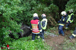 LAXENBURG (NÖ): Die Freiwillige Feuerwehr Laxenburg wurde am 23. Juni 2015 um 09:11 Uhr zu einer Fahrzeugbergung auf die L154, Münchendorferstraße, alarmiert. Ein Pkw war von der Fahrbahn abgekommen, über die Böschung gerutscht und am Dach im Bachbett des Laxenburger Kanals liegen geblieben.