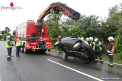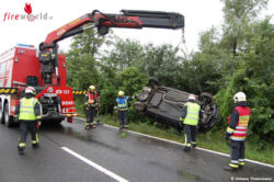 Mit dem Kran des SRF nach Anschlagen eines Kettengehänges wurde das Unfallfahrzeug aus dem Bachbett zurück auf die Fahrbahn gehoben und anschließend händisch wieder auf die Räder gestellt.