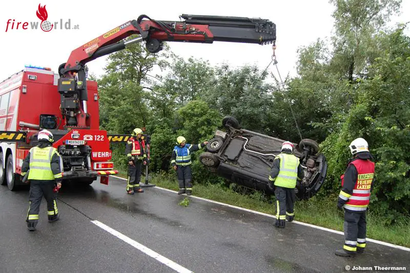 LAXENBURG (NÖ): Die Freiwillige Feuerwehr Laxenburg wurde am 23. Juni 2015 um 09:11 Uhr zu einer Fahrzeugbergung auf die L154, Münchendorferstraße, alarmiert. Ein Pkw war von der Fahrbahn abgekommen, über die Böschung gerutscht und am Dach im Bachbett des Laxenburger Kanals liegen geblieben.