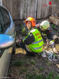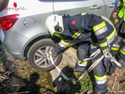 Am Einsatzort eingetroffen machte sich der Feuerwehreinsatzleiter ein Bild von der Lage, ein PKW war bei dem Versuch zu wenden, zu weit in den Straßengraben gefahren und saß mit der Hinterachse auf einem Betonblock auf. Umgehend wurde das Fahrzeug gegen ein weiteres Abrutschen gesichert und ein Brandschutz aufgebaut.
