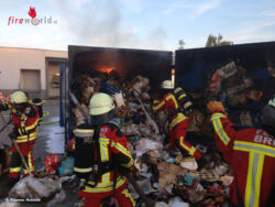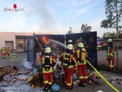 Vor Ort stellte sich heraus, dass es sich um einen 10 qm großer Restmüllcontainer mit Presse handeltet der direkt am Gebäude stand. Ein Mitarbeiter versuchte den Brand von Innen über die Müllabfuhrtür zu löschen, musste aber den Versuch abbrechen, weil die Flammen schon aus dem Behälter schlugen.