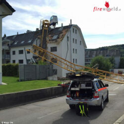 URDORF (SCHWEIZ): Bei einem Kranunfall in Urdorf ist am Nachmittag des 25. Juni 2015 ein Mehrfamilienhaus massiv beschädigt worden. Ein Bewohner wurde leicht verletzt.