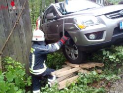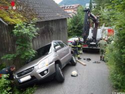 Beim Eintreffen der Einsatzkräfte der FF Mitterweißenbach wurde das Fahrzeug sofort gesichert, um einen möglichen Zusammenstoß mit der Hütte zu verhindern. Über die OÖ Landeswarnzentrale wurden die Kameraden der FF Bad Ischl zur Unterstützung mit dem Kran des schweren Rüstfahrzeuges nachalarmiert.