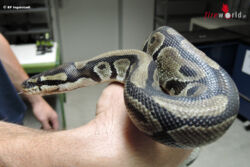 Die alarmiere Polizeistreife rief schließlich die Feuerwehr zu Rate. Die Besatzung des Kleinalarmfahrzeuges konnte den Königspython schnell einfangen. Bereitwillig schlängelte er sich fast von alleine in die Transportkiste der Feuerwehrmänner. Bei dem Exemplar dürfte es sich um ein Jungtier handeln. Im ausgewachsenen Zustand werden diese ungiftigen Würgeschlangen gut zwei Meter lang.