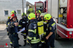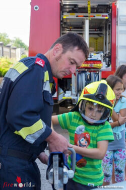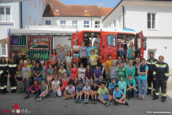 Was nach einem Schreckenszenario klingt, war glücklicherweise nur eine Übung! Am Sammelplatz erklärte Kommandant Leo Stiefsohn den Kindern noch, dass sie keine Angst vor einem Marsmännchen haben müssen, sondern das lediglich Atemschutzgeräteträger sind, die Menschen aus verrauchten Gebäuden retten und diese Geräte zum Atmen brauchen. Im Anschluss durchliefen alle 4.Klässler einen Stationsbetrieb, um das Feuerwehrwesen näher kennenzulernen. Nicht ganz uneigennützig, ist die Feuerwehr doch immer auf der Suche nach neuen Gesichtern ab 10 Jahren. Beim Rüstfahrzeug konnten die Kids erleben, wie es ist, ein Auto für eine Menschenrettung vorzubereiten und beim Wechselladefahrzeug in luftige Höhen schnuppern. Beim Tanklöschfahrzeug durfte jeder den Atemschutz selbst ausprobieren und natürlich auch