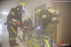 Da es in der älteren Bauetappe 3 nicht ganz unbedenklich ist, geistig beeinträchtigte Menschen über Hubrettungsgeräte zu evakuieren, wurde bei dieser Übung davon Abstand genommen. Vielmehr wurden die Teleskopmastbühne sowie die beiden Drehleitern als Angriffsweg benutzt. Ebenso nutzte man die Sonderfahrzeuge dafür, um die im Grunde ja in rauchfreien Zonen befindlichen Klienten durch Feuerwehrleute zu beruhigen.