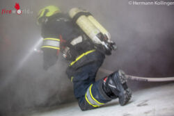 Der per Schlauchtragekörbe vorgehende Atemschutztrupp konnte den Brandherd selbst relativ schnell ausmachen. Mit mehreren Hochleistungslüftern wurde unter Hochdruck daran gearbeitet, den verrauchten Teil des Kellergeschosses und des Stiegenhauses rauchfrei zu machen.