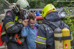 Gegen Ende der Übung erfolgte zwecks Übung die Evakuierung mehrerer Gruppen aus rauchfreien Zonen. Vor allem der Umgang mit beeinträchtigen Menschen ist für Einsatzkräfte eine nicht alltägliche Situation.