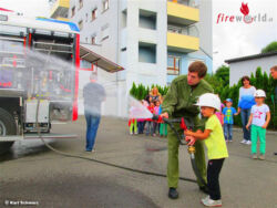 Mit OFM Lukas Sitter und OFM Daniel Schmied wurde es zum Abschluss noch richtig ernst, denn da durfte jedes Kind mit einen Strahlrohr einen simulierten Brand bekämpfen. Die Kinder hatten auch ein Geschenk für die Feuerwehr parat: Ein sehr schön gezeichnetes Portrait der Feuerwehr.