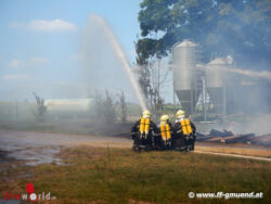 Beim Eintreffen der Feuerwehren zeigte sich ein in Vollbrand stehender Wirtschaftstrakt eines landwirtschaftlichen Anwesens. Der Brand drohte auch auf benachbarte Objekte sowie einen Gastank überzugreifen. Der Auftrag an die Feuerwehr der Stadt Gmünd lautete, gemeinsam mit der Feuerwehr Groß Höbarthen den Gastank zu schützen. Seitens der Feuerwehr der Stadt Gmünd wurden insgesamt drei Strahlrohre vorgenommen, der Gastank konnte gekühlt und die Brände in der Umgebung weitgehend zurückgeschlagen werden. Nach mehrfacher Überprüfung der Temperatur des Gastanks mittels Wärmebildkamera drangen die Kameraden Thomas Schulner, Joachim Weiss und Mattias Böhm mit schwerem Atemschutz zum Gastank vor und sperrten den Hauptschieber zum Brandobjekt ab. Danach wurden noch Nachlöscharbeiten in der unmittelbaren Umgebung des Gastanks durchgeführt.