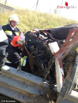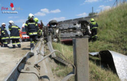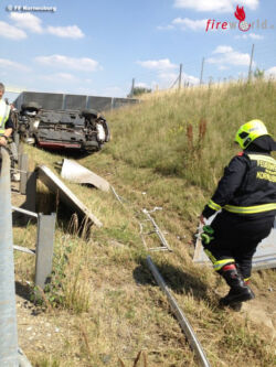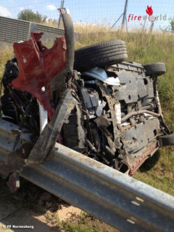 KORNEUBURG (NÖ): Am 2. Juli 2015 wurde die Freiwillige Feuerwehr der Stadt Korneuburg zu einem Verkehrsunfall mit dem Alarmstichwort „T2-Menschenrettung“ alarmiert. Ein Pkw war von der Fahrbahn abgekommen und auf der Seite liegend im Straßengraben liegen geblieben.