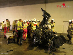 Um 19.51 Uhr erreichte die Feuerwehr die Meldung, dass ein Pkw gegen das Tunnelportal des Ambergtunnels gekracht sei. Die ersteintreffenden Kräfte fanden einen völlig demolierten Pkw vor, in dem eine Person eingeklemmt war. Gemeindem mit der Ortsfeuerwehr Rankweil konnte die Person aus dem Fahrzeug befreit und an den Rettungsdienst übergeben werden.