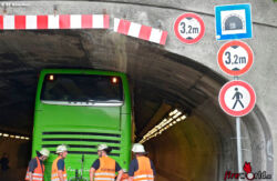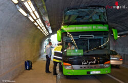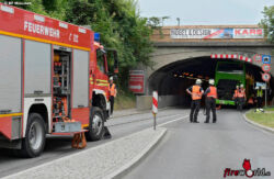MÜNCHEN (BAYERN): Ein ungewöhnliches Bild bot sich zu Mittag des 3. Juli 2015 den Einsatzkräften der Feuerwehr München. Ein Doppeldeckerbus steckte diesmal komplett in der Unterführung fest. Der Fahrer des leeren Reisebusses schätzte die reale Höhe seines Transportmittels wohl viel zu niedrig ein und bohrte sich cirka 25 Meter weit in die Bahnunterführung.