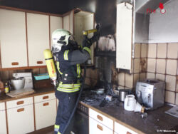 Auf der Herdplatte wurde eine Pfanne Fett zu heiß und verrauchte daher massiv die Küche. Weiters stand der Motor des Dunstabzuges in Flammen. Durch die starke Hitzeeinwirkung schmolzen auch die Deckenlampen. Der Atemschutztrupp ging mit einem Hochdruckrohr zur Brandbekämpfung vor. Der leicht brennende Dunstabzugsmotor wie auch die verrußten Küchenschränke wurden in den Innenhof getragen, wo sie dann zu Gänze gelöscht wurden. Die Fenster wurden geöffnet damit der Rauch entweichen konnte. Durch das besonnene Eingreifen des Atemschutztrupps mussten lediglich ca. 5 Liter Wasser verwendet werden.