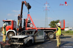 Die Bergung des ausgebrannten Fahrzeugs wurde durch das Wechselladefahrzeug übernommen. Die Feuerwehr stand mit vier Fahrzeugen und 20 Mann im Einsatz.