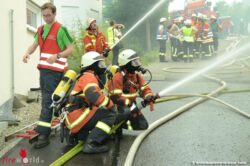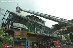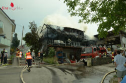Die Einsatzkräfte der Feuerwehren versuchten, neben den Außenangriffen mittels zweier Drehleitern, das Feuer im Innenangriff zu löschen. Dies musste sehr schnell abgebrochen werden, da die Decke stark beschädigt war und akute Einsturzgefahr herrschte. Somit konnte das Gebäude nur von außen gelöscht werden. Gegen 18.00 Uhr wurde mit sieben C-Rohre und zwei Wenderohre (Drehleitern) gelöscht.