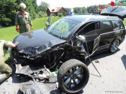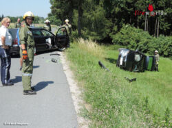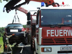 Zwei Pkw sind aus bisher unbekannter Ursache zusammengestoßen. Die Einsatzstelle war bereits durch die FF Blumau/Wild abgesichert, die verletzten Lenker durch das Rote Kreuz abtransportiert. Ein Pkw stand auf der Fahrbahn, der zweite lag seitlich in der angrenzenden drei Meter tiefen Wiese. Nach Absprache mit der anwesenden Polizei wurde mit der Pkw Bergung begonnen.