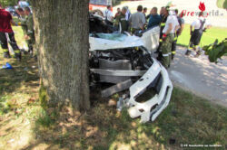An der Einsatzstelle im Gemeindegebiet Mehrnbach bot sich der FF Neuhofen folgende Lage: Frontalkollision eines Sportwagens mit einem Baum mit zwei massiv eingeklemmten Personen. Eine dritte Person wurde von einem Ersthelfer bereits über das Schiebedach gerettet.