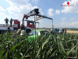 Nach Freigabe der Unfallstelle durch die Polizei konnte der PKW mittels Kran des Wechselladefahrzeuges und hydr. Bergekreuz rasch verladen und anschließend gesichert in Grafenwörth abgestellt werden.