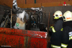 Bei der Erkundung stellte sich folgende Lage heraus: Ein im Schuppen eingestellter Traktor stand in Vollbrand, der Brand drohte auf den Holzbau überzugreifen. Mit zwei C-Rohren von Tank 1 wurde zunächst der Schuppen geschützt um den Brand an der Ausbreitung zu hindern. Der brennende Traktor wurde mit Mittelschaum unter umluftunabhängigem Atemschutz niedergeschlagen. Der Traktor wurde ins Freie gezogen und dort nochmals auf Glutnester überprüft. Der Schuppen wurde mit der Wärmebildkamera kontrolliert, Tank 2 stellte in der Nacht die Brandwache.