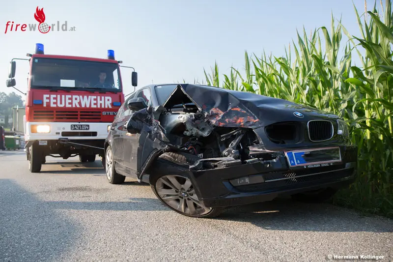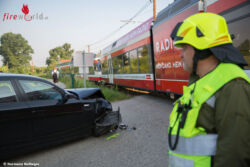 ALKOVEN (OÖ): Per 06.59 Uhr erfolgte am 7. Juli 2015 die Alarmierung der beiden Alkovener Feuerwehren zu einem Verkehrsunfall in der Wehrgasse in Straßham. Die Lenkerin eines Pkw hatte zuvor beim Queren der Gleise der Linzer Lokalbahn eine aus Alkoven herannahende Garnitur übersehen.