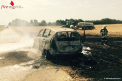 PRELLENKIRCHEN (NÖ): Am Vormittag des 8. Juli 2015 geriet ein Pkw am Güterweg zwischen Prellenkirchen und Deutsch Haslau in Brand. Die Lenkerin hatte den Brand bemerkt, das Fahrzeug in ein Feld gelenkt und selbst die Feuerwehr verständigt.