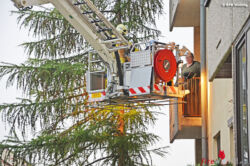 Da eine Bewohnerin Kreislaufprobleme in ihrer Wohnung erlitt und dadurch über das Stiegenhaus nicht gerettet werden konnte, wurde Dr. Mosser sofort mittels Steig Vösendorf über ihren Balkon zu der Frau gebracht. In ihrer Wohnung konnte er die Patientin untersuchen und betreuen.