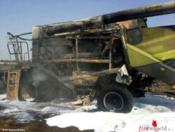 Am Einsatzort eingetroffen, fand man einen im Vollbrand stehenden Mähdrescher und ein brennendes Weizenfeld vor. Mittels Tanklöschfahrzeugen und Pumpenfässern wurde ein Pendelverkehr zur Löschwasserversorgung von den Feuerwehren sichergestellt und der Brand unter Atemschutz bekämpft.