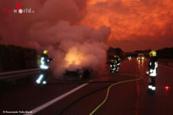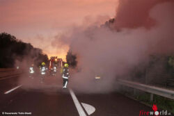 Beim Eintreffen der alarmierten Feuerwehren am Einsatzort stand das Fahrzeug bereits in Vollbrand und die Flammen hatten bereits auf die Lärmschutzwand übergegriffen. Erst unter schwerem Atemschutz konnte der Brand mit zwei C-Rohren erfolgreich bekämpft werden. Für die brennenden Aluminiumteile musste ein Pulverlöscher eingesetzt werden.
