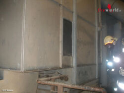 Am Einsatzort angekommen wurde von der FF Bildein die Anlage entleert und ein Atemschutztrupp führte die Löscharbeiten über eine Tür im oberen Teil der Trocknungsanlage durch. Eine Zubringleitung von einem nahegelegenen Löschwasserbehälter wurde vorbereitet. Die Freiwillige Feuerwehr Eberau stellte den Reserveatemschutztrupp und versorgte uns mit Wasser. Da die Ausbruchsstelle schwer zugänglich war wurde die Anlage, an der Stelle an welcher das Feuer das Blech zerstörte, mit einem Trennschleifer geöffnet.