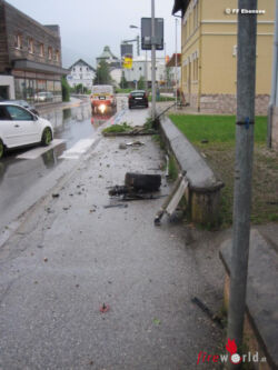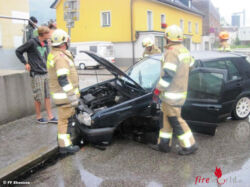 EBENSEE (OÖ): Am Donnerstag, dem 09.07.2015, wurde die Freiw. Feuerwehr Ebensee um 19.36 Uhr zu einem Verkehrsunfall alarmiert. Aus unbekannter Ursache kam ein Pkw von der Fahrbahn ab, ritt auf eine Parkplatzbegrenzung auf und kam am vis-à-vis liegendem Gehsteig zum Stehen.