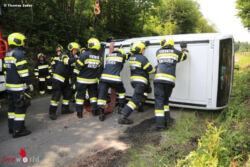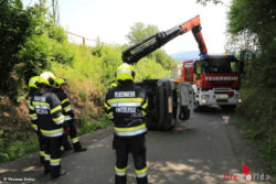 Aus bisher unbekannter Ursache kam ein voll beladener Transporter im Gemeindegebiet von Kobenz ins Schleudern und stürzte seitlich um. Für die 22 eingesetzten Feuerwehrmänner unter Einsatzleiter Hauptbrandinspektor Werner Holzer galt es das umgestürzte Fahrzeug aufzurichten und die ausgetretenen Betriebsmittel zu binden. Mit dem Kran des Wechselladefahrzeuges wurde das Fahrzeug rasch wieder auf die Räder gestellt. Die Straße musste während der gesamten Aufräumungs- und Bergearbeiten für den Verkehr gesperrt.