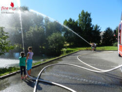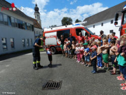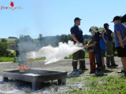 Danach erfolgte die Gruppenaufteilung für die verschiedenen Stationen: Bei der Feuerwehr Rainbach waren folgende drei Stationen untergebracht: die richtige Handhabung eines Feuerlöschers, die Vorführung des hydraulischen Rettungsgeräts und die Vorstellung des TLFA2000, bei dem die wasserführenden Armaturen gleich selbst ausprobiert werden konnten. Mit den Feuerwehrfahrzeugen wurde die Hin- und Rückfahrt nach Höcking organisiert, wo sich die beiden Stationen „Kübelspritzen“ und „Löschen von Fettbränden“ befanden.