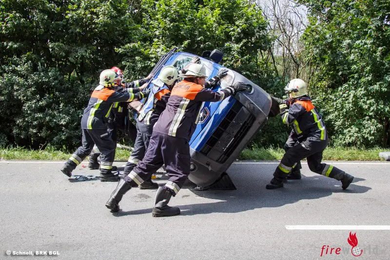 Der Fahrer eines blauen Peugeot-Handwerker-Fahrzeugs aus Salzburg war von Laufen kommend in Richtung Freilassing unterwegs und wollte offenbar eine Fahrzeugkolonne überholen. Als er zum Überholen ansetzte, wollte gleichzeitig ein schwarzer Mitsubishi vor ihm ebenfalls überholen. Aus Schreck verriss der Österreicher das Steuer seines Kastenwagens, geriet aufs Bankett und überschlug sich, wobei er auf der Beifahrerseite liegen blieb. Er streifte dabei einen neben ihm fahrenden weißen Peugeot an der hinteren linken Seite. Der weiße Peugeot drehte sich und schleuderte in die gegenüberliegende Böschung.