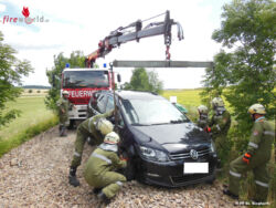 Bei der Ankunft bot sich folgende Lage: Ein Pkw-Lenker war mit seinem Fahrzeug irrtümlich auf Trasse der aufgelassenen Bahn hinter dem Friedhof gefahren. Dabei geriet er in den Graben und konnte nicht mehr aus eigener Kraft herausfahren. Er sprach an der Baustelle an der ehemaligen Bahnübersetzung Ellendserstraße den gerade vorbeigehnden HBM Reegen an und schilderte ihm das Geschehen. Es wurde die Feuerwehr alarmiert. Der Pkw konnte mit dem Kran des Last schonend aus dem Graben gehoben werden. Der Lenker konnte unter Aufsicht von Feuerwehrkameraden den Schotterweg verlassen und seine Fahrt fortsetzen. Nach einer halben Stunde konnte die Feuerwehr mit MTF, Last und 8 Mitgliedern wieder einrücken.
