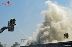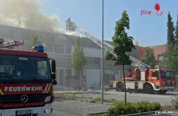 Hier war unter dem Flachdach des zweistöckigen Gewerbeobjekts ein Feuer ausgebrochen und hatte bereits die Dachhaut druchbrannt, so dass offene Flammen sichtbar waren. Schnell stellte sich die Ausdehnung auf das gesamte Gebäude mit rund 20 auf 40 Meter heraus, woraufhin weitere Kräfte nachalarmiert wurden.