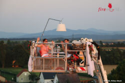 Unter allen teilnehmenden Besuchern wurde ein exklusives Dinner hoch über den Dächern St. Pöltens verlost. Die glücklichen Gewinner waren das junge Ehepaar Melanie und Jakob aus St. Pölten. Nachdem aufgrund des verregneten Sommers 2014 kein passender Termin gefunden wurde, war es nun am Donnerstag, dem 16. Juli 2015, soweit. Bei strahlenden Sonnenschein wurden die beiden Gewinner direkt von ihrem Haus am Kremserberg mit der Teleskopmastbühne (TMB – 54) abgeholt.